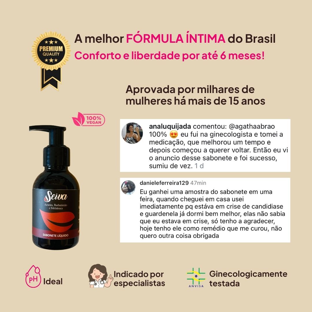 Está formula maravilhosa, inspirada na antiga técnica milenar do banho de acento, com extrato de barbatimão e aroeira, foi aprimorada de maneira espetacular pela Seiva, com o poderoso óleo essencial de melaleuca que é o melhor antifúngico e anti-inflamatório da natureza.